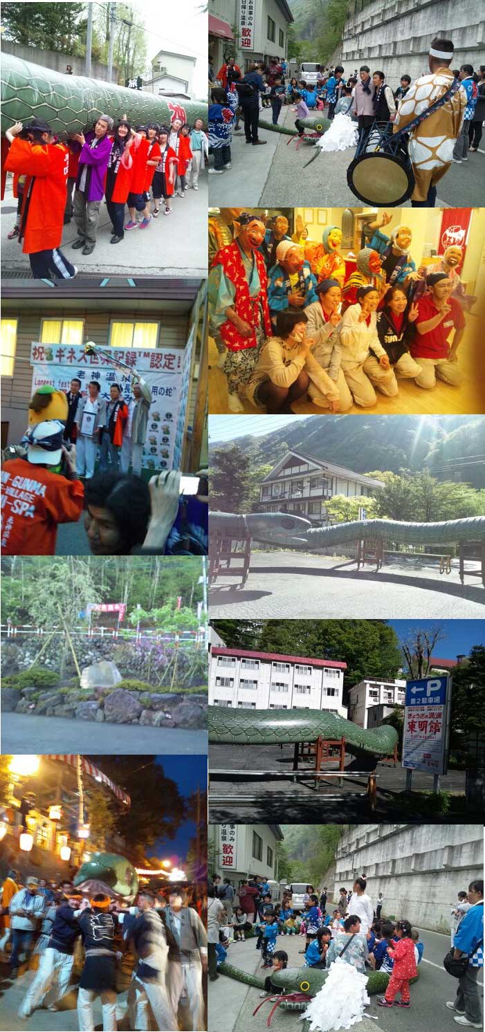 その後、万病に効く温泉を見つけてくれた老神の神『蛇』に感謝する『大蛇祭り』が例年行なわれています。ご神体として、担がれる大蛇は、地元有志の手作りで、長さ108メートル、重さ約2トン、胴回り直径1.3メートルの豪快な大蛇で担ぎ手は200名以上です。